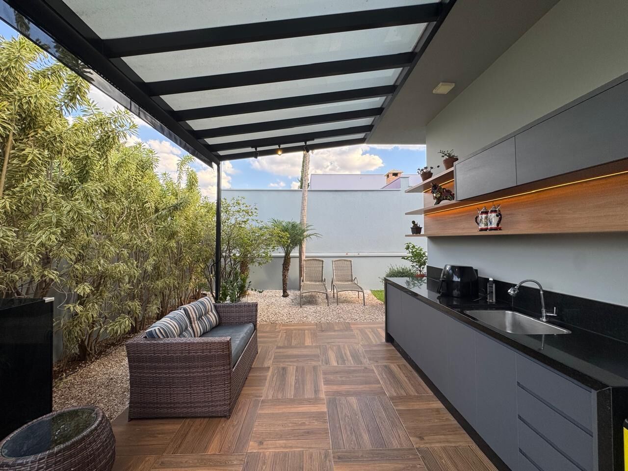 Com 401 m² de terreno e 175 m² de construção, essa casa em conceito aberto oferece 2 dormitórios, sendo 1 suíte ampla com closet e banheiro com 2 duchas e 2 cubas. Ambientes completos com móveis planejados e ar condicionado.