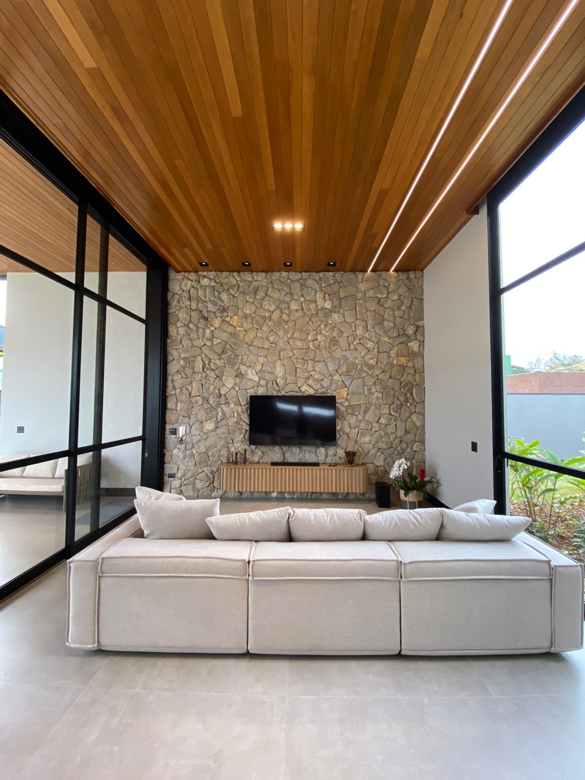 O living com pé-direito de 4 metros, esquadrias em alumínio e acabamento em madeira tauari cria uma integração perfeita entre o interno e o externo da casa 🌿