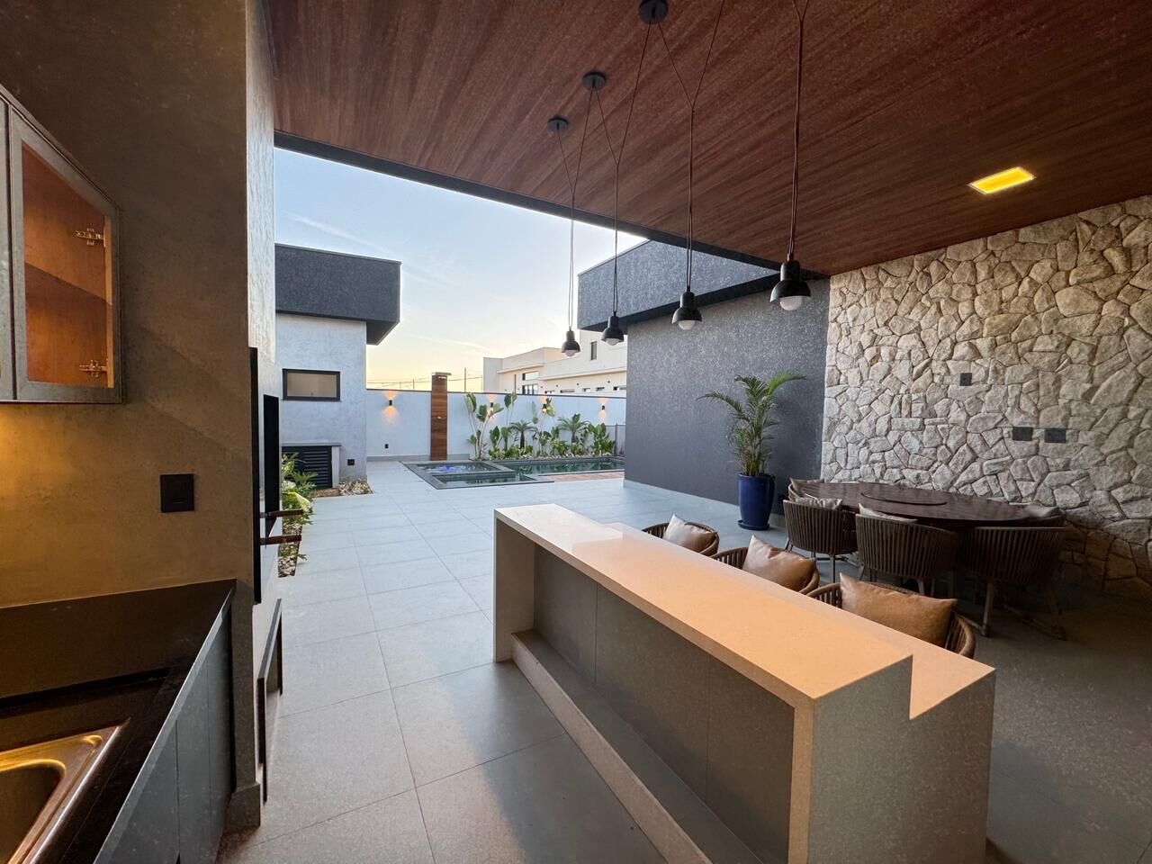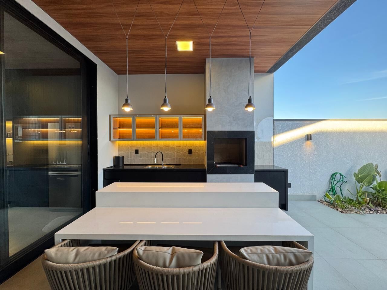 🍽️ Living integrado com pé-direito alto, cozinha planejada e área gourmet com churrasqueira em quartzo branco