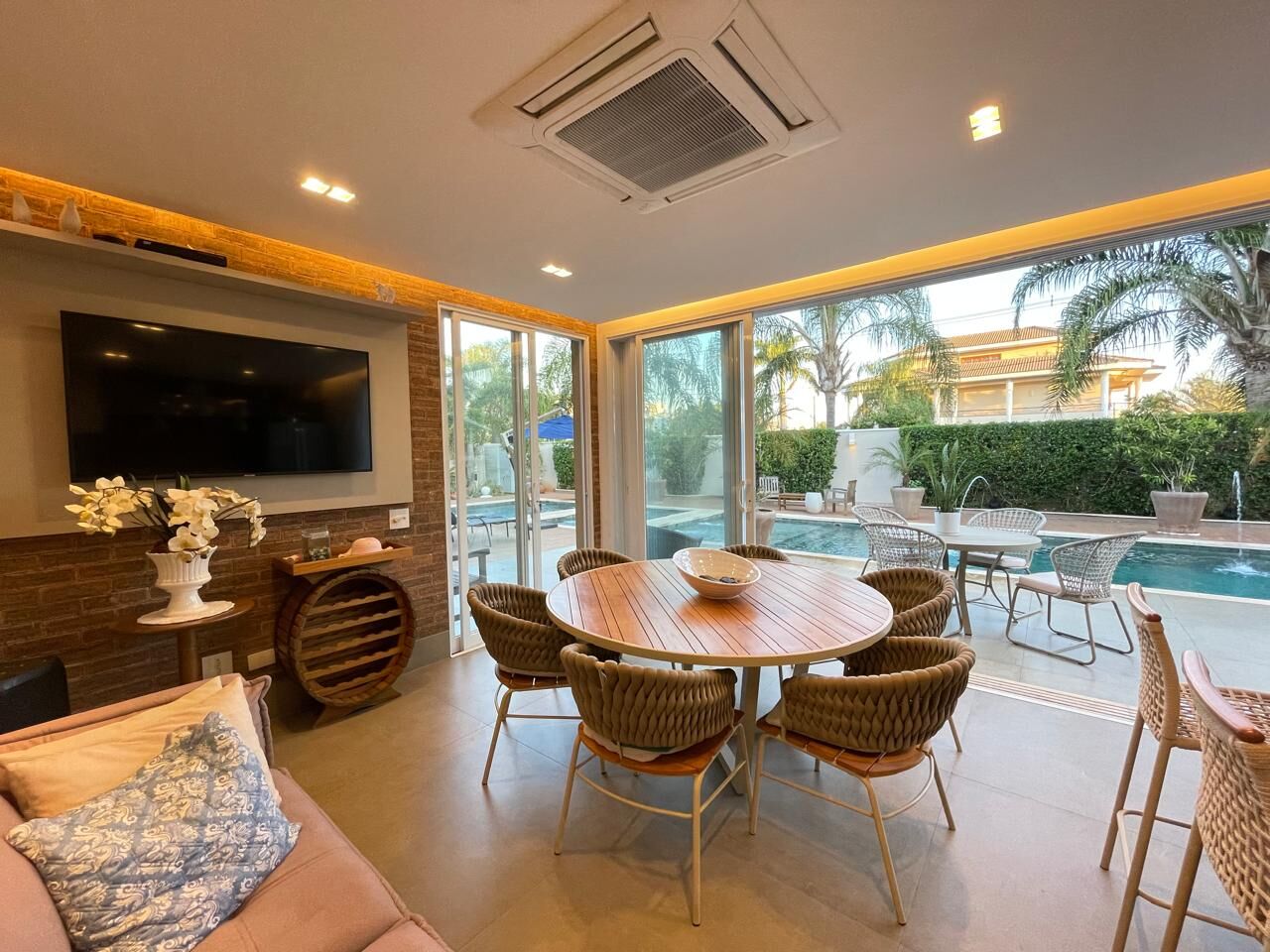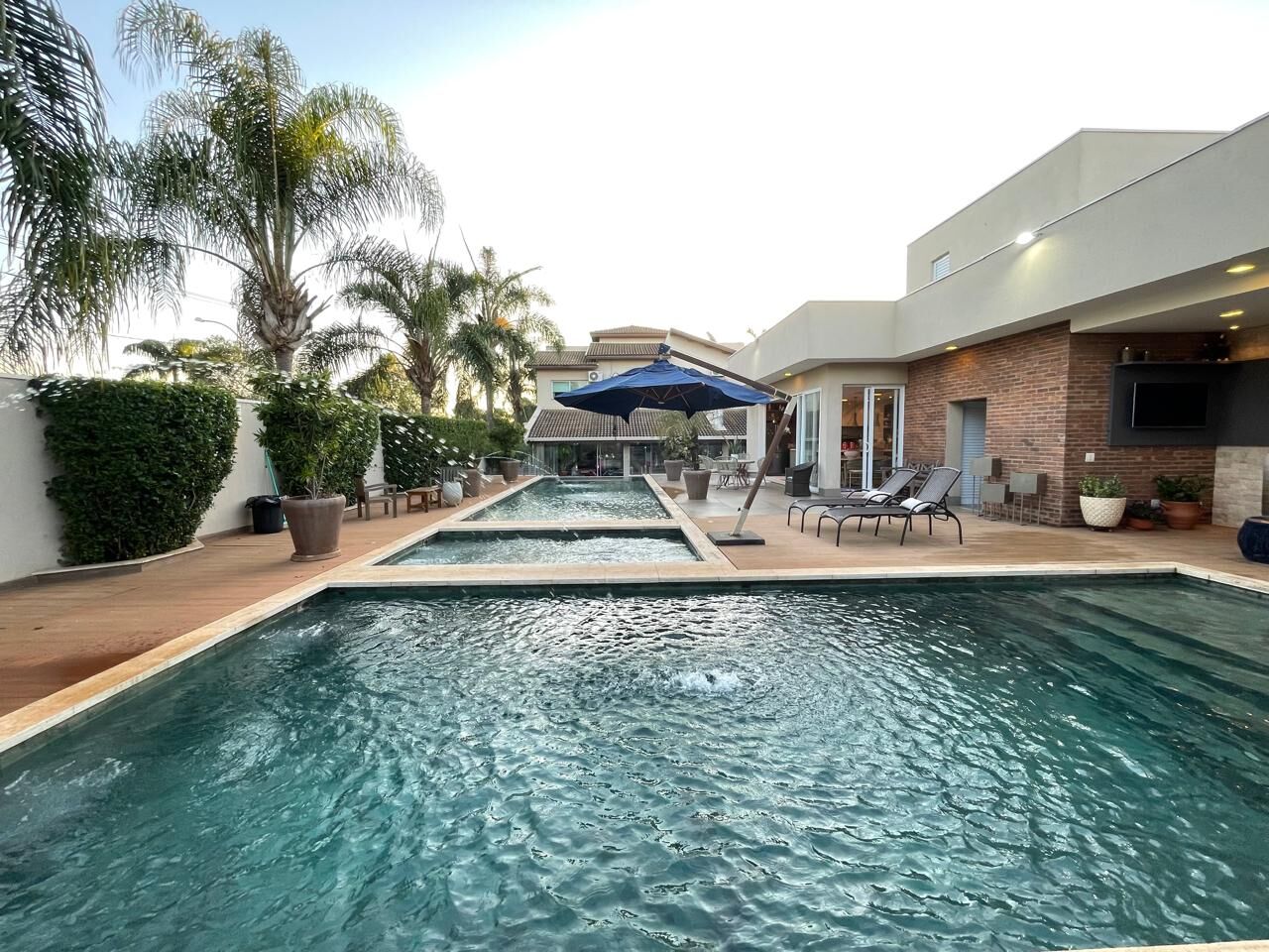 Esta residência de alto padrão, com área construída de 370 m², oferece 4 dormitórios, e um escritório, incluindo uma suíte master equipada com closet e banheira de hidromassagem. A cozinha é planejada, com lavanderia e despensa adjacentes, além de duas áreas gourmet. Uma das áreas gourmet fica ao lado das três piscinas aquecidas com cascata, enquanto a outra é integrada à cozinha.