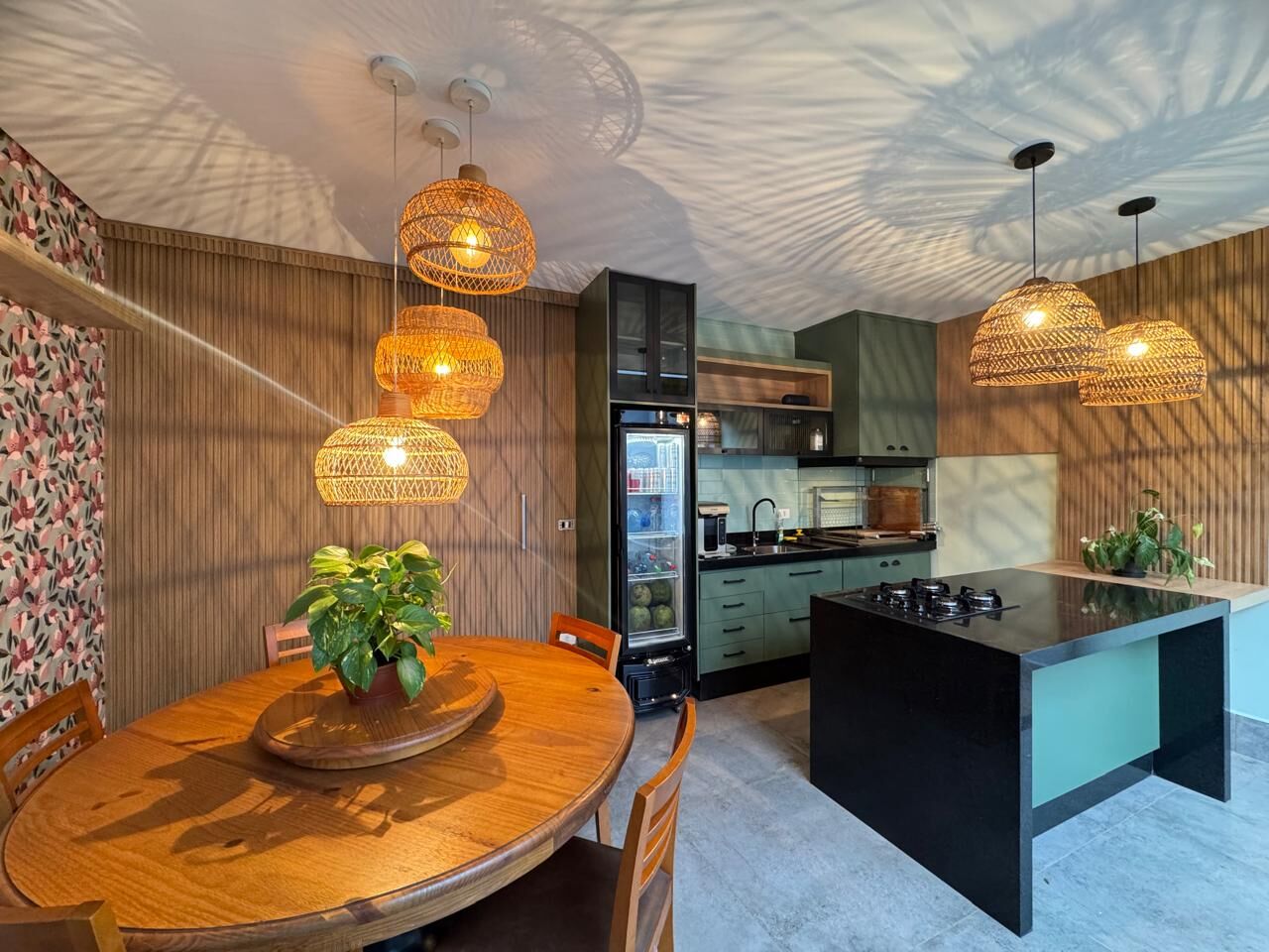 A cozinha planejada com ilha é um destaque à parte, totalmente equipada e integrada à área gourmet completa com churrasqueira, forno e cooktop.